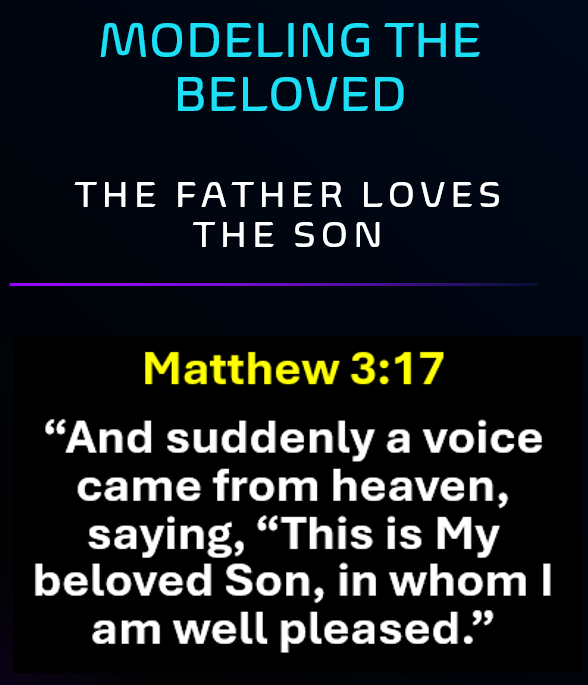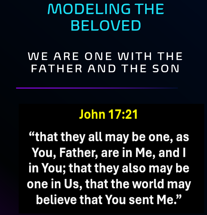 We believe that the Father Loves the Son (Matthew 3:17) and the Son Loves the Father (John 14:31). Jesus modeled the Beloved of the Father and as members of the Body of Christ, we too are called to model the Beloved in an answer to Jesus’ prayer in John 17:21 “that they all may be one, as You, Father, are in Me, and I in You; that they also may be one in Us, that the world may believe that You sent Me.”